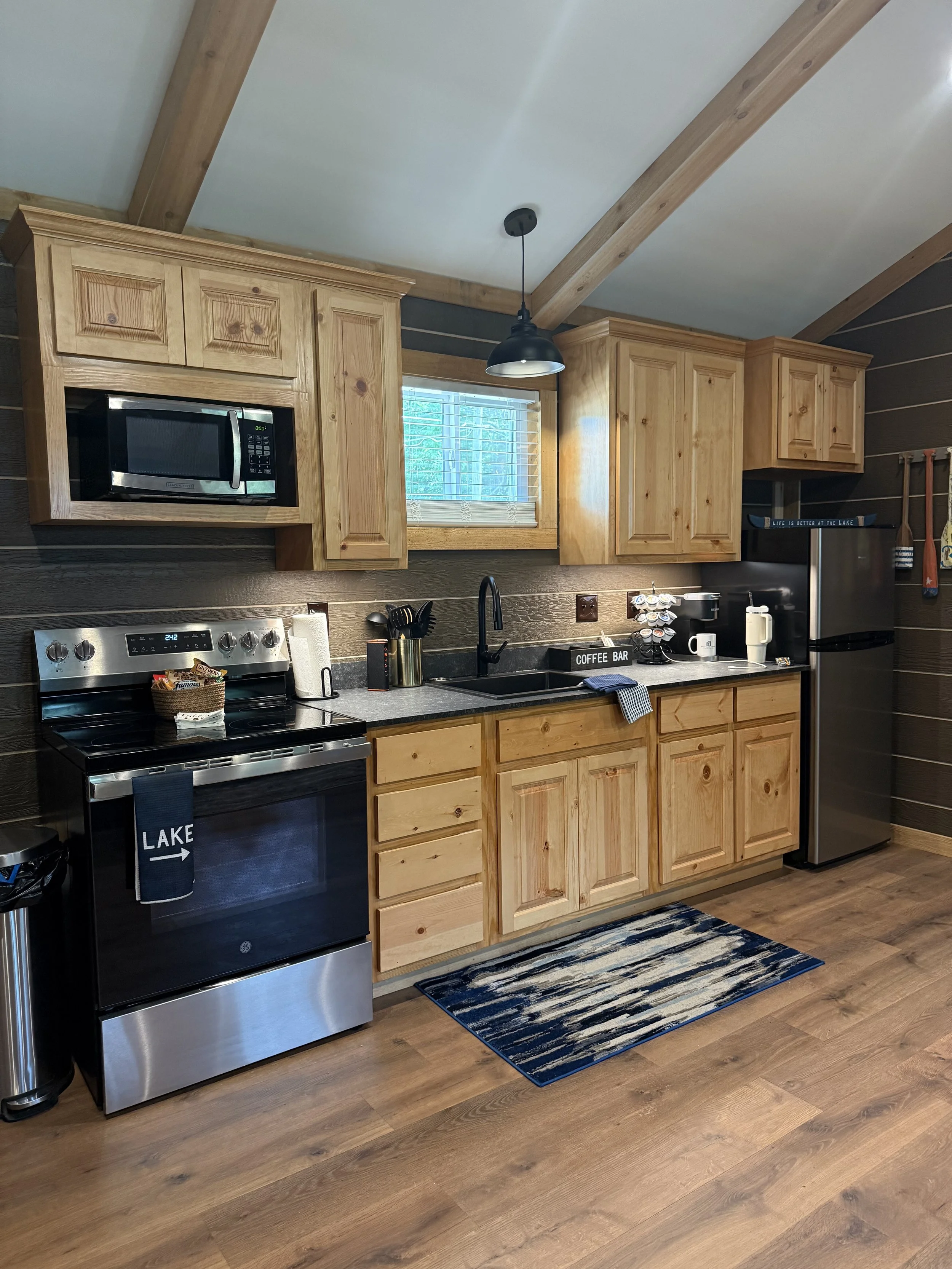 Enjoy a beautiful, all-new kitchen, dining, and living areas with a new queen sleeper sofa. The kitchen is fully equipped with brand-new appliances: refrigerator, stove, microwave, Keurig with coffee, plus all new cookware and dishware. Complimentary Wi-Fi and cable TV are included.