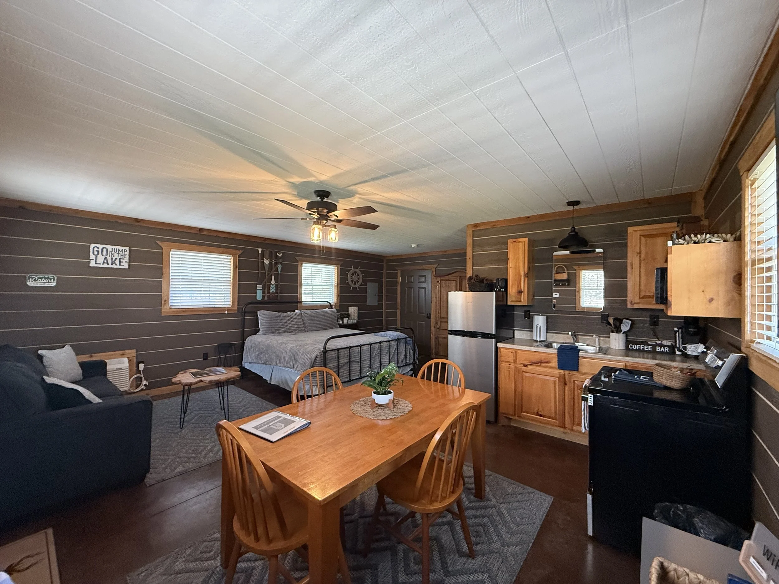 Unwind in this spacious king studio cabin with a brand-new hot tub perfect for stargazing. It features a new king bed, cozy bathroom, and a living/dining area with a sleeper sofa for extra guests.
